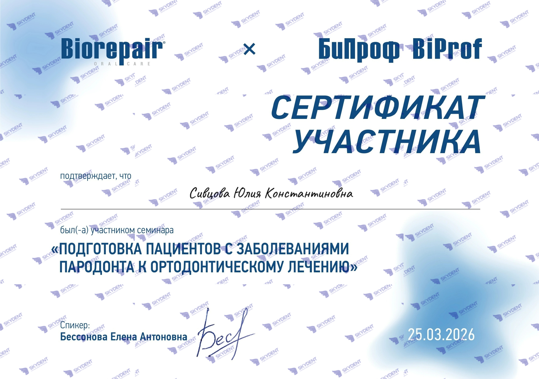2026 г. - Семинар "Подготовка пациентов с заболеваниями пародонта к ортодонтическому лечению". Лектор: Бессонова Елена Антоновна. Сертификаты