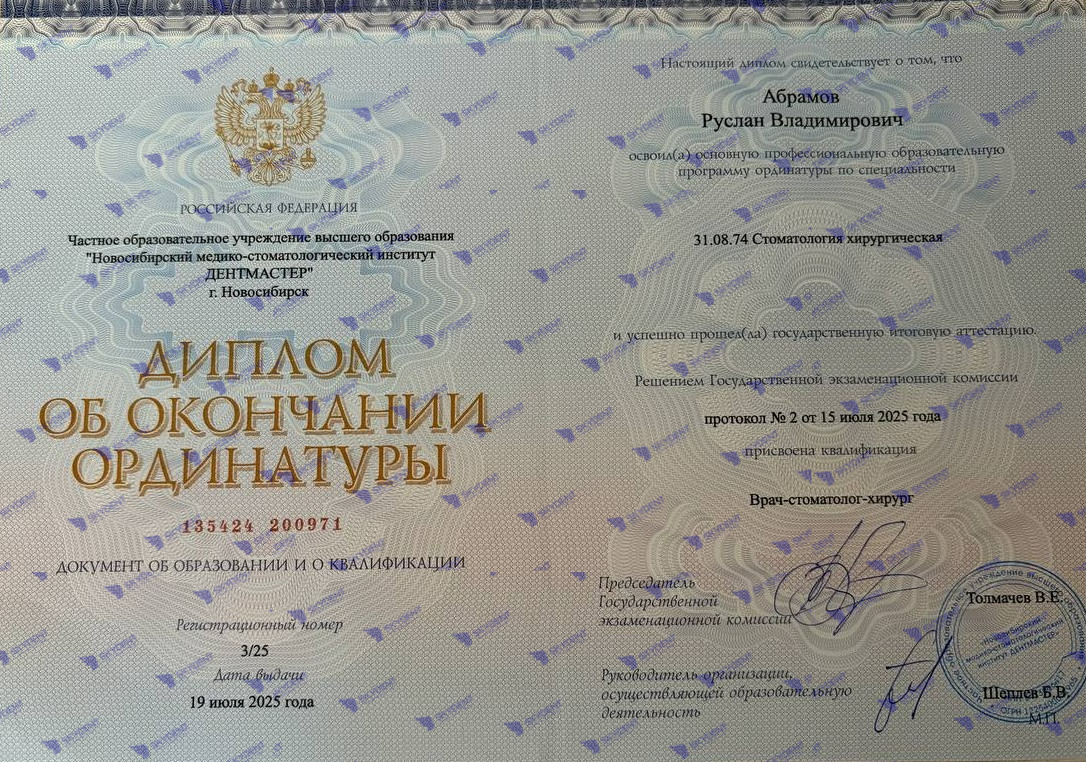 2017г. - прошёл первичную аккредитацию по специальности "стоматология общей практики"2023-2025г. Ординатура по специальности "стоматология хирургическая" в Новосибирском медико-стоматологическом институте ДЕНТМАСТЕР"