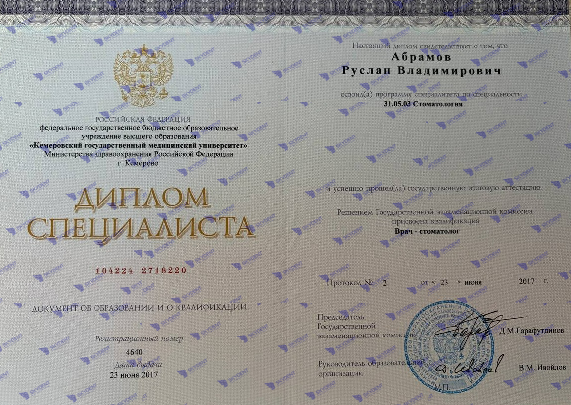 2012-2017г. - окончил "Кемеровский государственный медицинский университет" по специальности "стоматология", диплом специалиста.