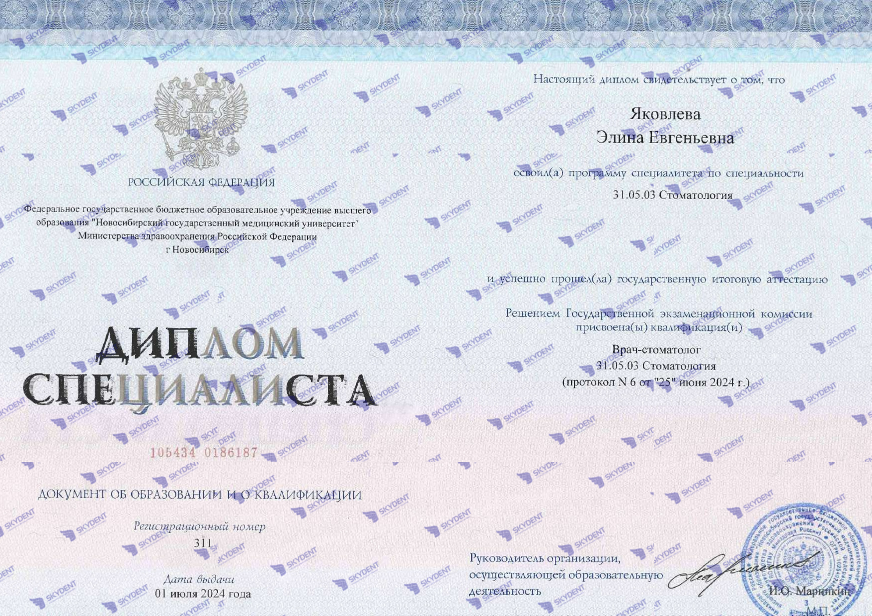 2019-2024 гг.- Окончила «Новосибирский государственный медицинский университет» по специальности «Стоматология», диплом специалиста.