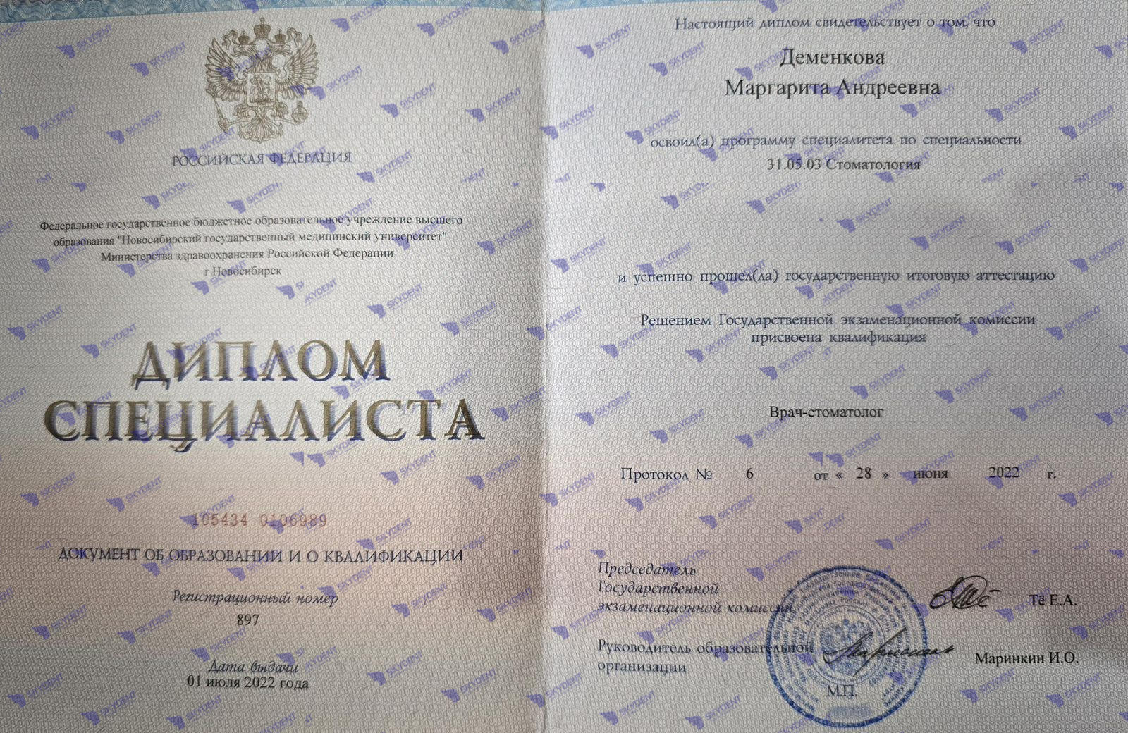 2022 г. - закончила ФГБОУ ВО Новосибирский Государственный Медицинский Университет МЗ РФ по специальности «Стоматология», квалификация «Врач-стоматолог общей практики»