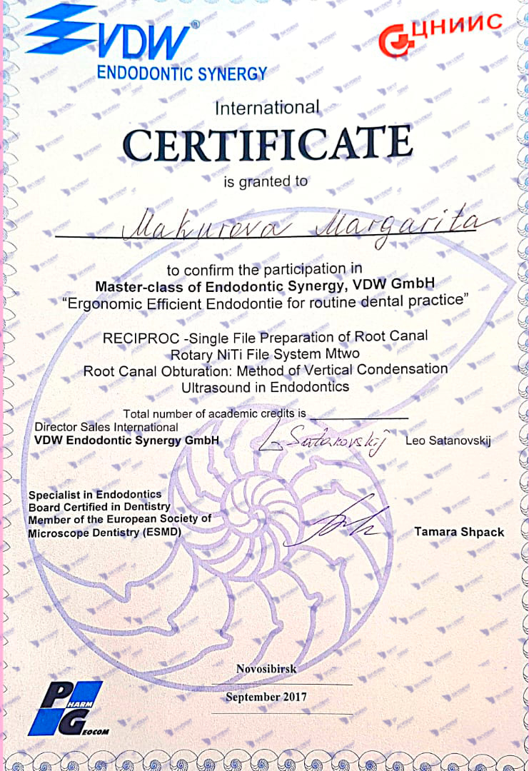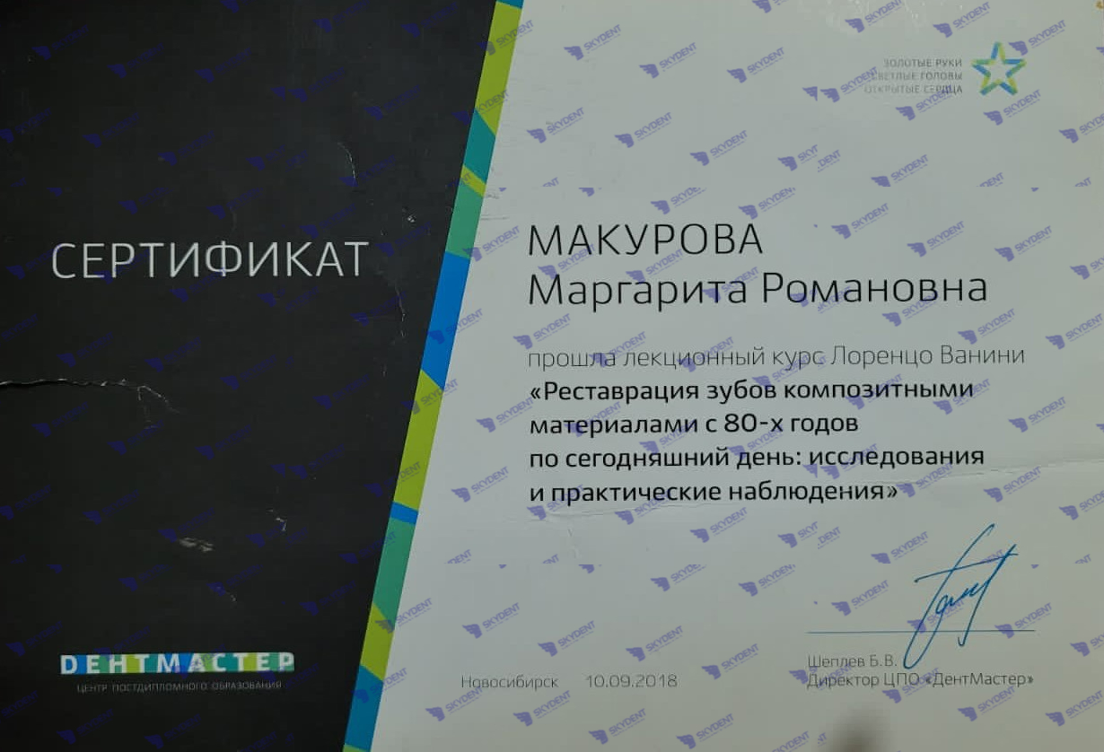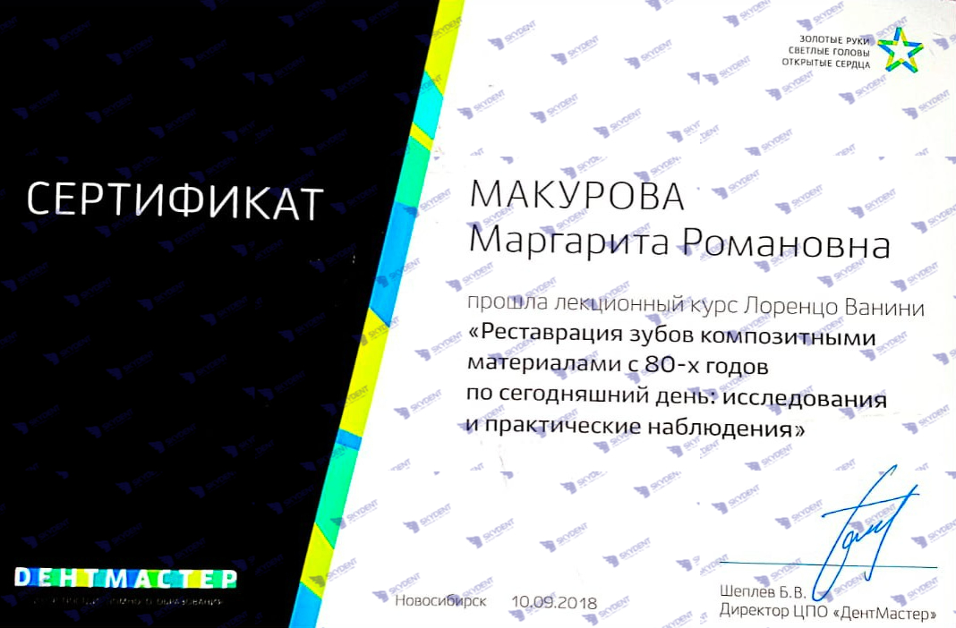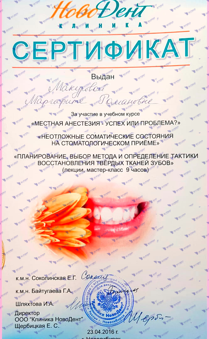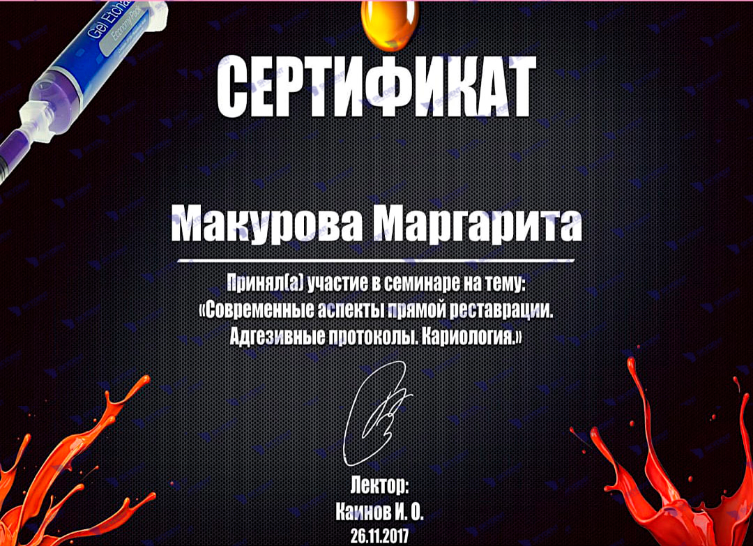 2015 г. – Учебный курс по реставрации: “Наиболее актуальные проблемы при работе в пришеечной области- повышенная чувствительность, кариозные и некариозные поражения. Грамотная профилактика в данной области”