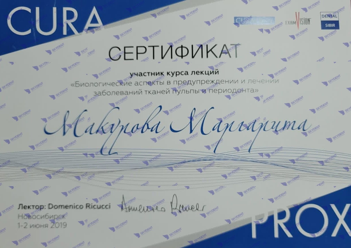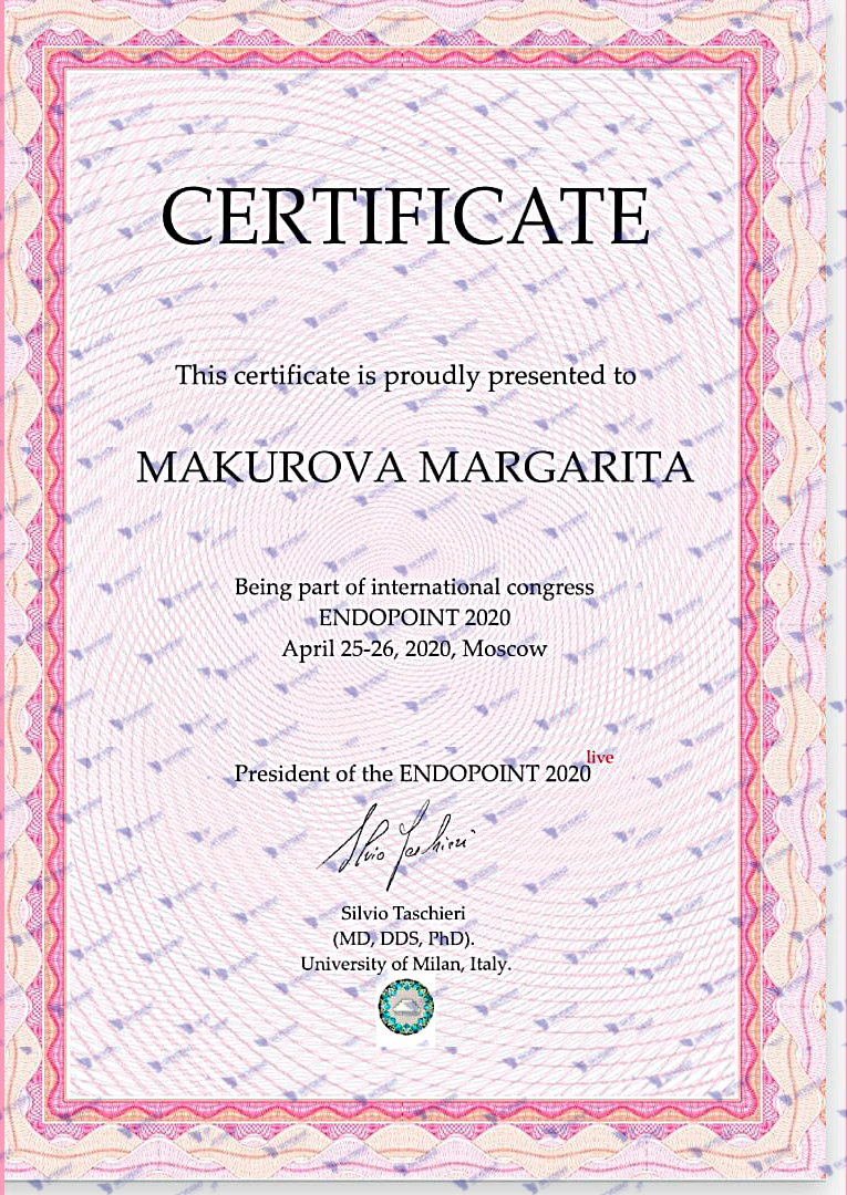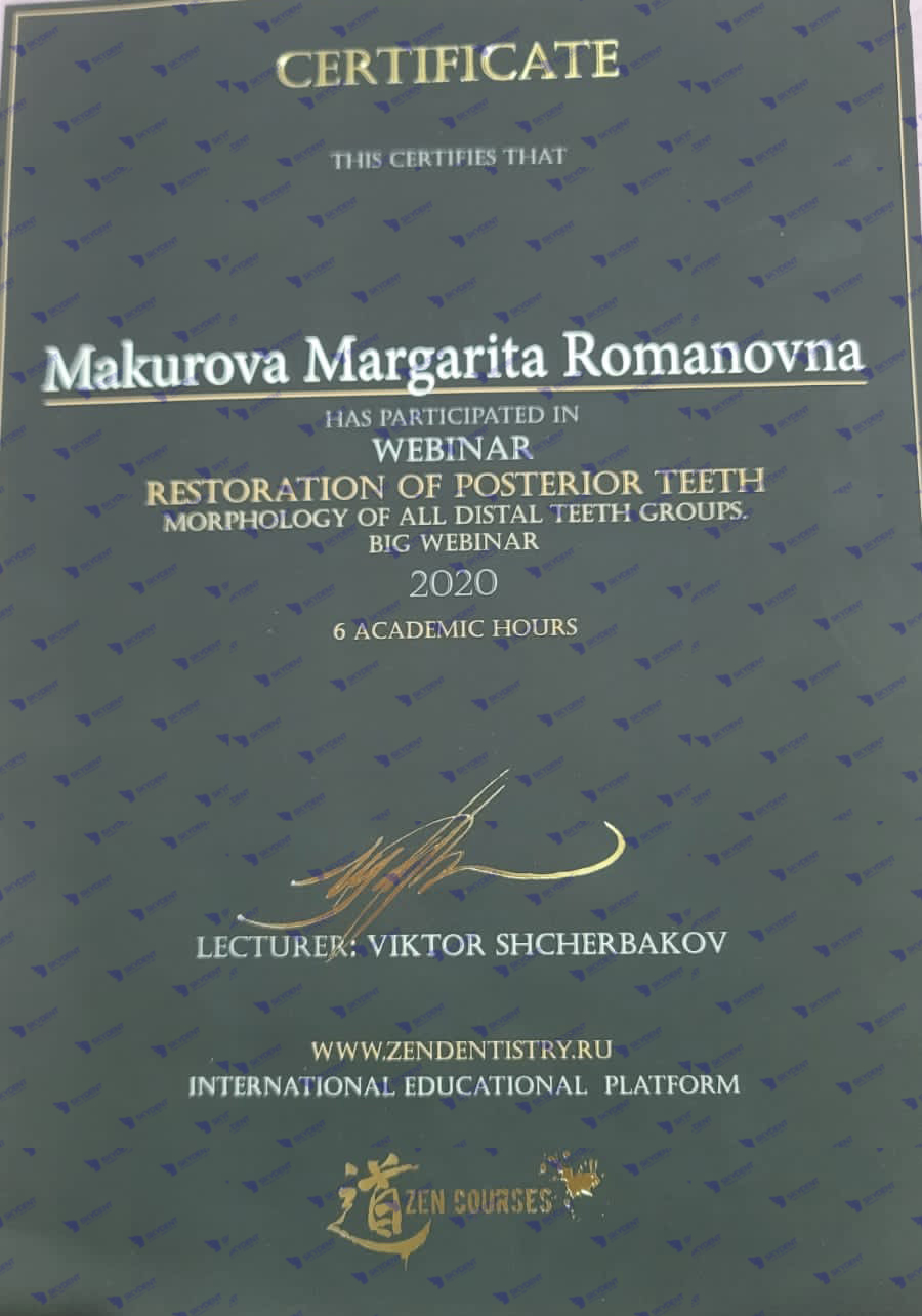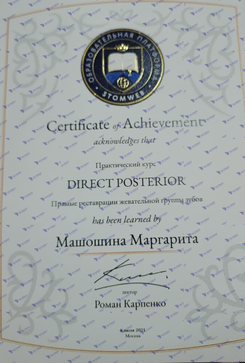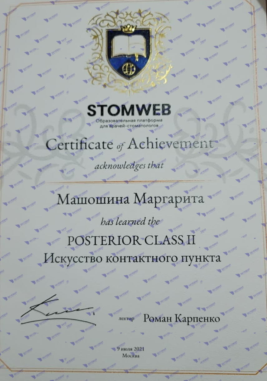 2015 г. – Учебный курс по реставрации: “Наиболее актуальные проблемы при работе в пришеечной области- повышенная чувствительность, кариозные и некариозные поражения. Грамотная профилактика в данной области”