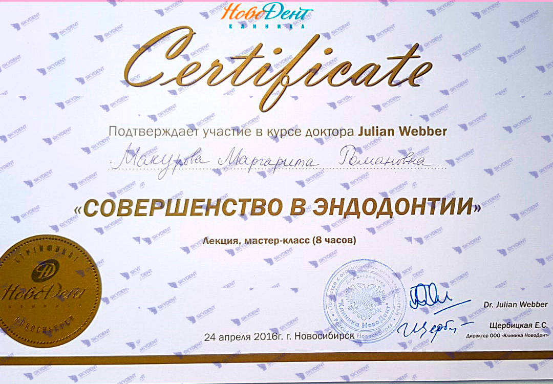2016 г. – Учебный курс: “Совершенство в эндодонтии”