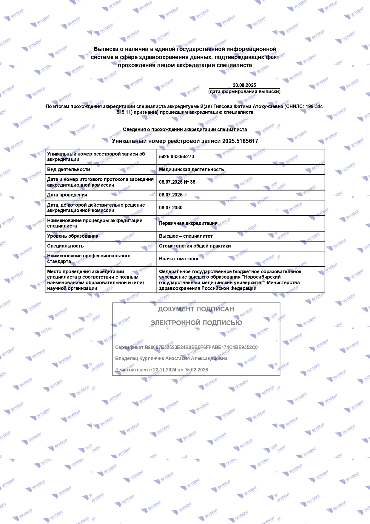 2025 г. – прошла первичную аккредитацию по специальности «Стоматология общей практики»2025 г. – поступила в ординатуру СибГМУ по специальности «хирургическая стоматология»