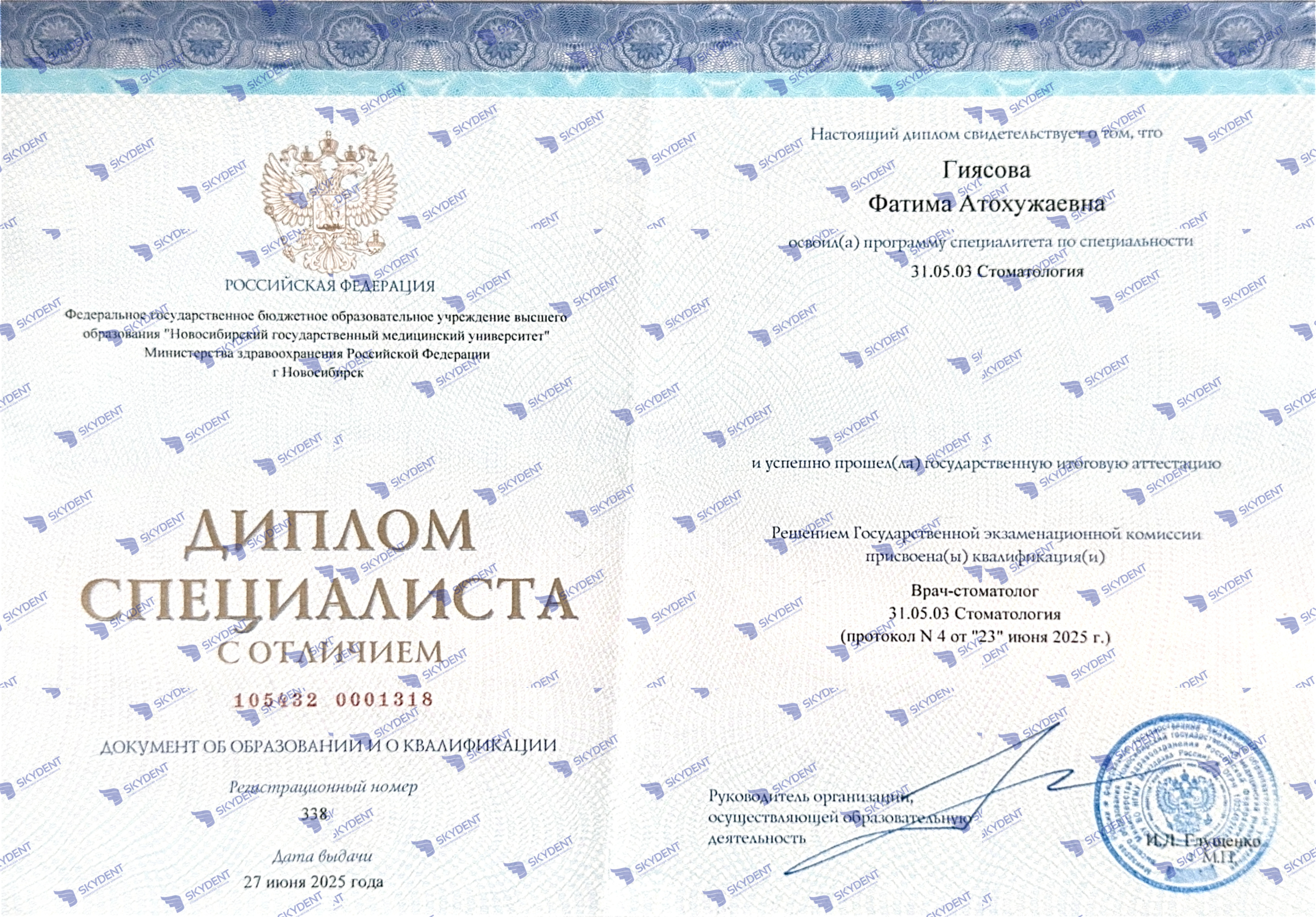 2020-2025 г. – закончила Новосибирский Государственный Медицинский Университет по специальности «Стоматология», диплом специалиста с отличием