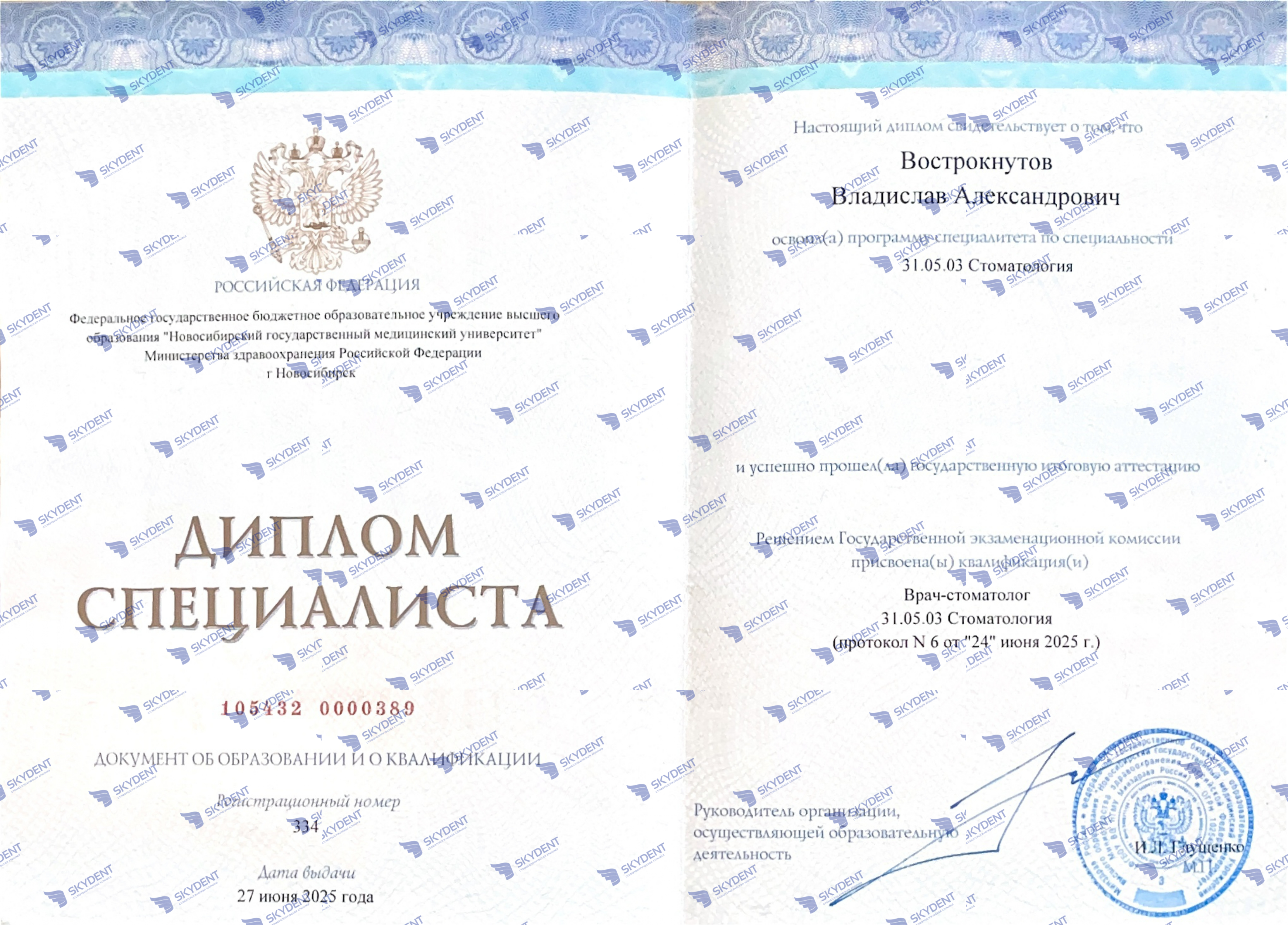 2025г. - закончил Новосибирский Государственный Медицинский Университет по специальности "Стоматология"